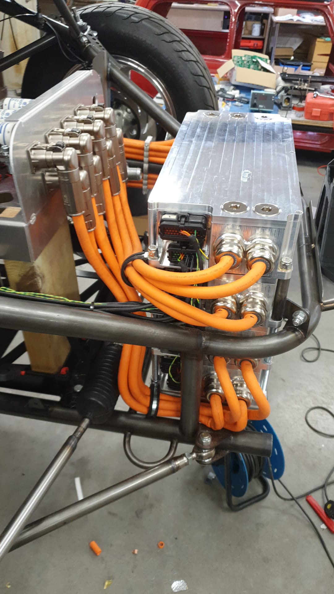 Four high-voltage motor inverters capable of handling over 1600 Amps combined. Each PM150 unit delivers 320kW peak at 800V, providing precise throttle response and programmable acceleration curves for different track conditions.
